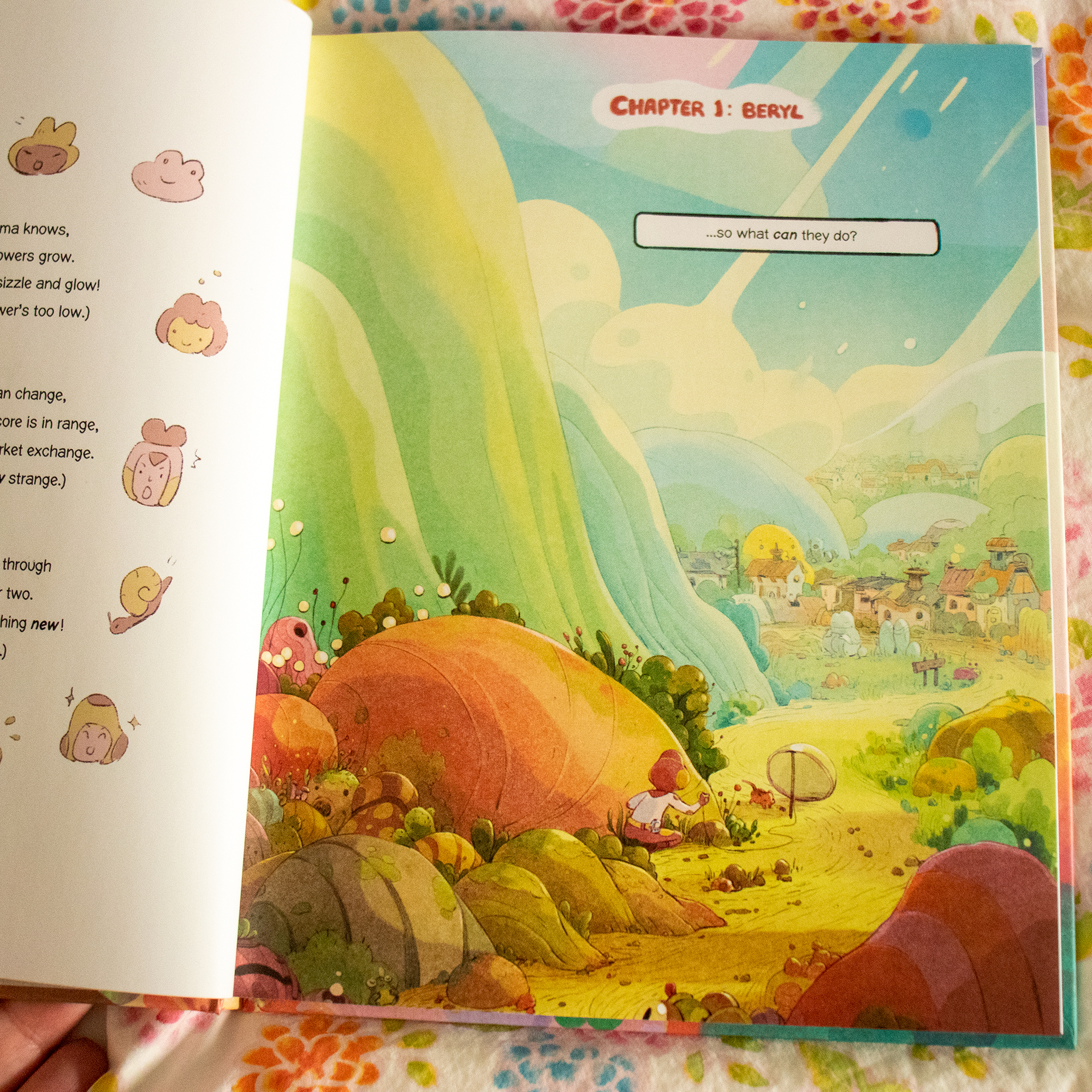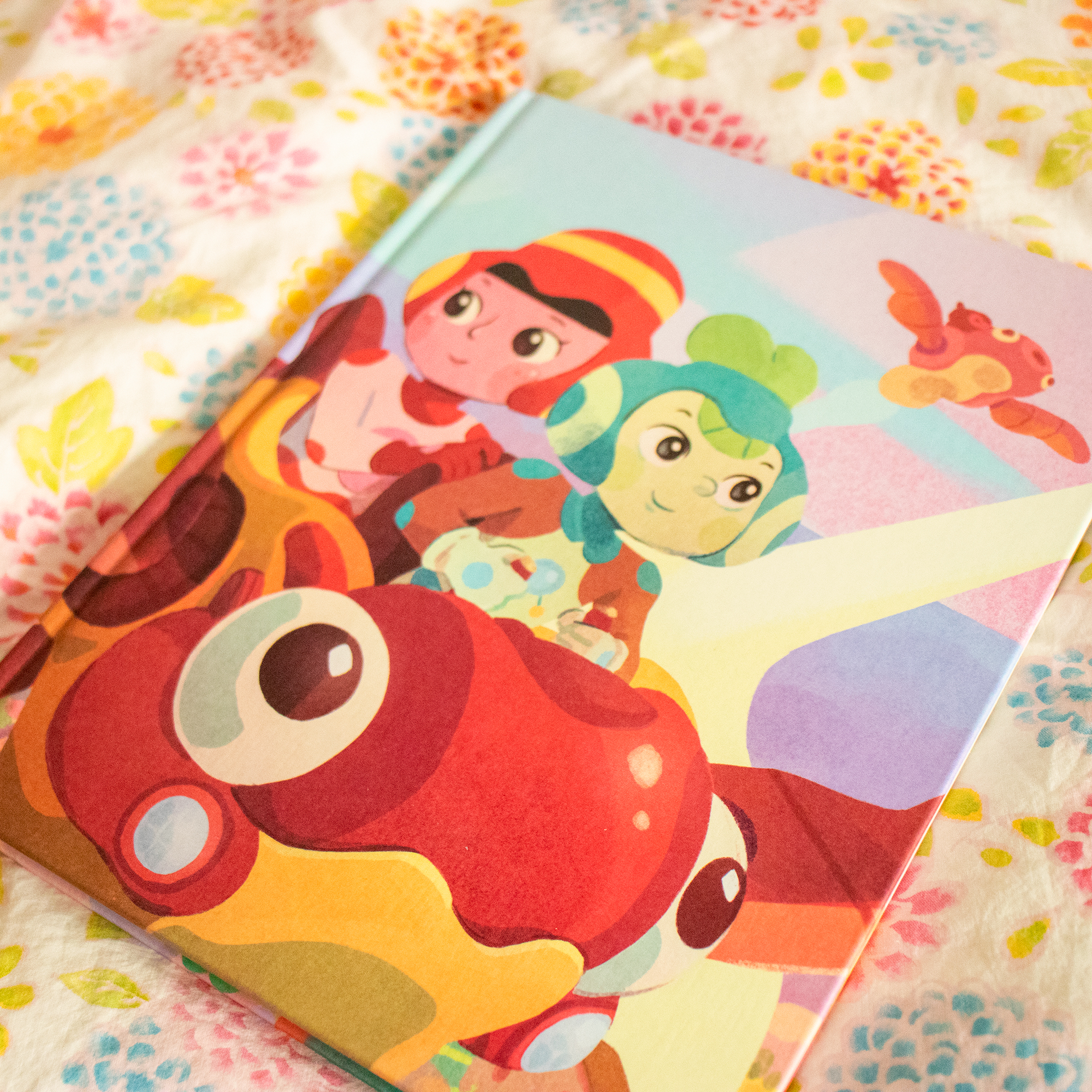Je me suis offerte cette petite merveille pour (à cause de ?) l’illustrateur Boya Sun que j’ai découvert grâce à l’excellente série 5 Mondes (un space opera écologique, jeunesse dont j’attends le 5è et dernier tome impatiemment). Ici, je retrouve avec plaisir son trait rond et ses couleurs acidulées et ce n’est que du bonheur 😍🍭🍬.