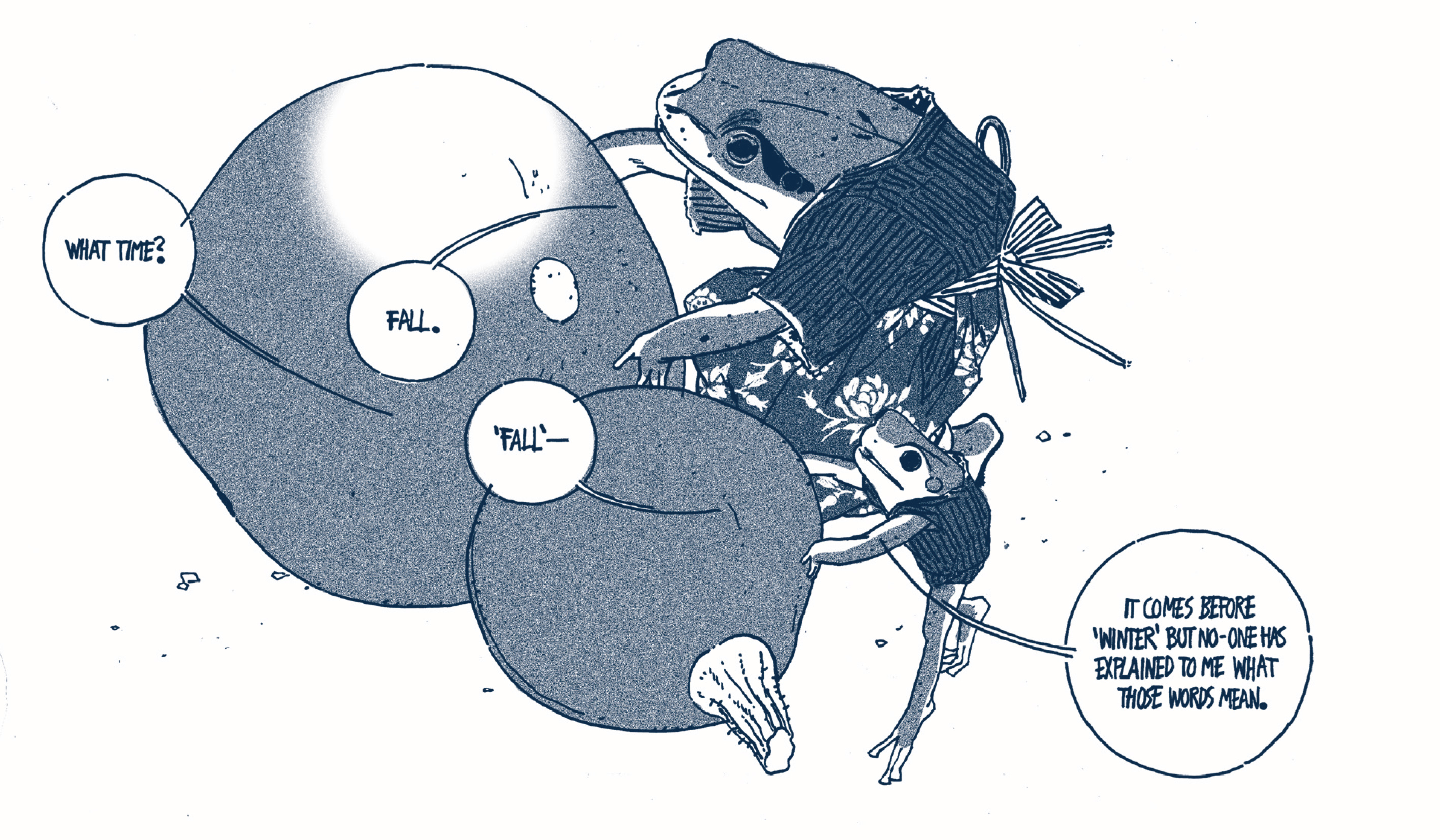Il s’agit, le temps d’une saison, de suivre la vie d’une petite grenouille qui expérimente tout pour la première fois. En chemin, la rainette rencontre des souris, des chats, des chiens, des arbres, des kakis, et autres êtres vivants fascinants. Ce récit initiatique se présente sous la forme d’un road-trip méditatif parsemé de réflexions sur la vie.
